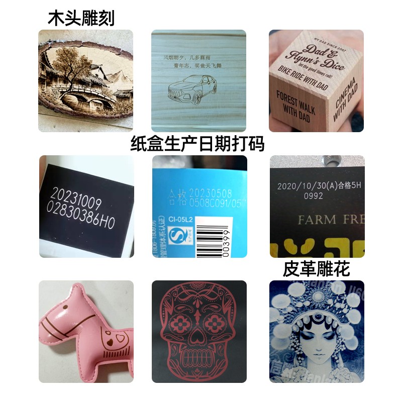 二氧化碳打標(biāo)機(jī)的應(yīng)用范圍非常廣泛,都是日常生產(chǎn)生活中常見的,如:木頭打標(biāo)、皮料雕花、紙盒打碼等。